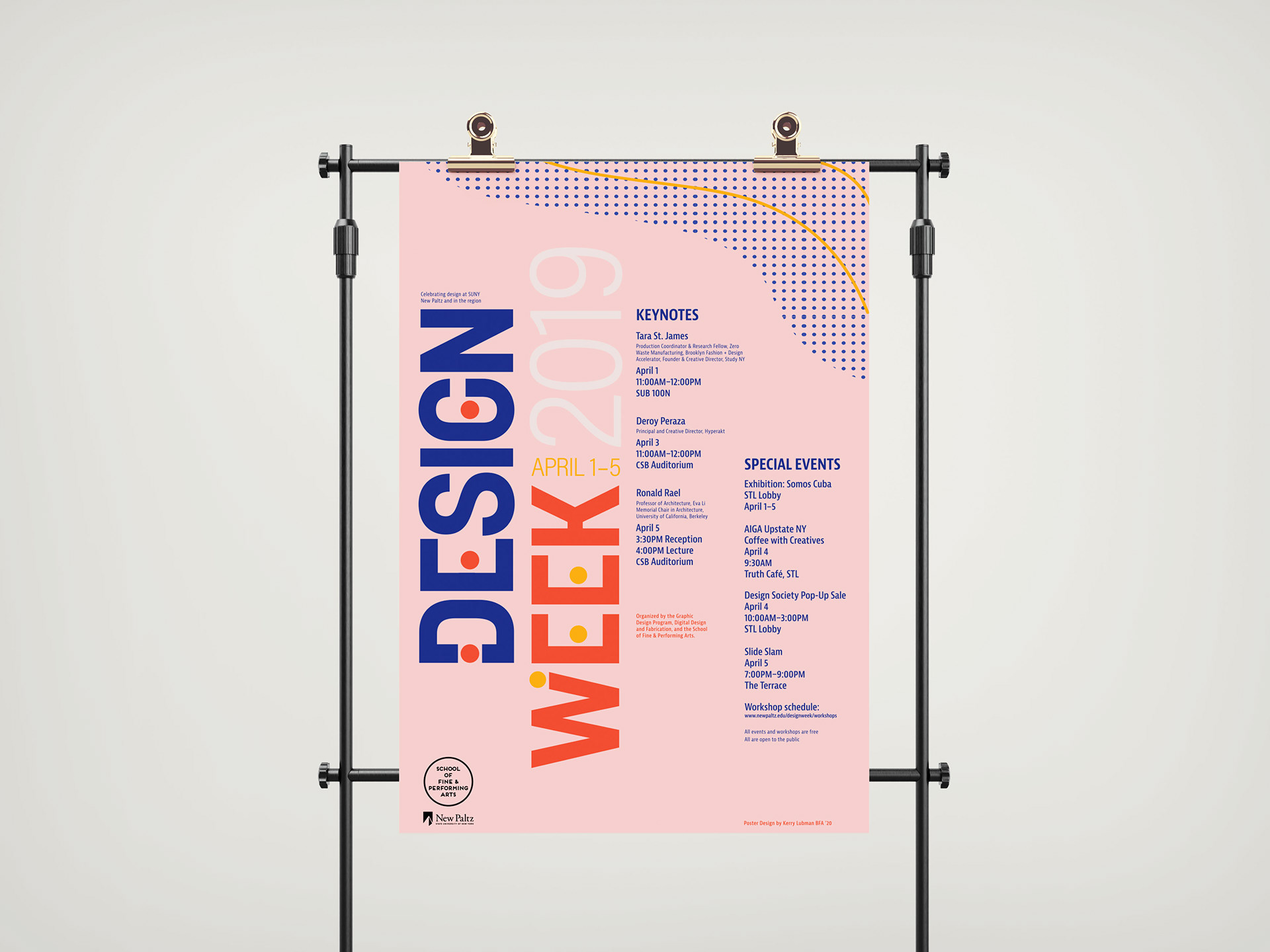 Design Week is annual, week-long series of lectures and workshops hosted by SUNY New Paltz. In 2019, the event focused on the intersection of various design disciplines—sustainable design, clothing design, industrial design, 3D printing.