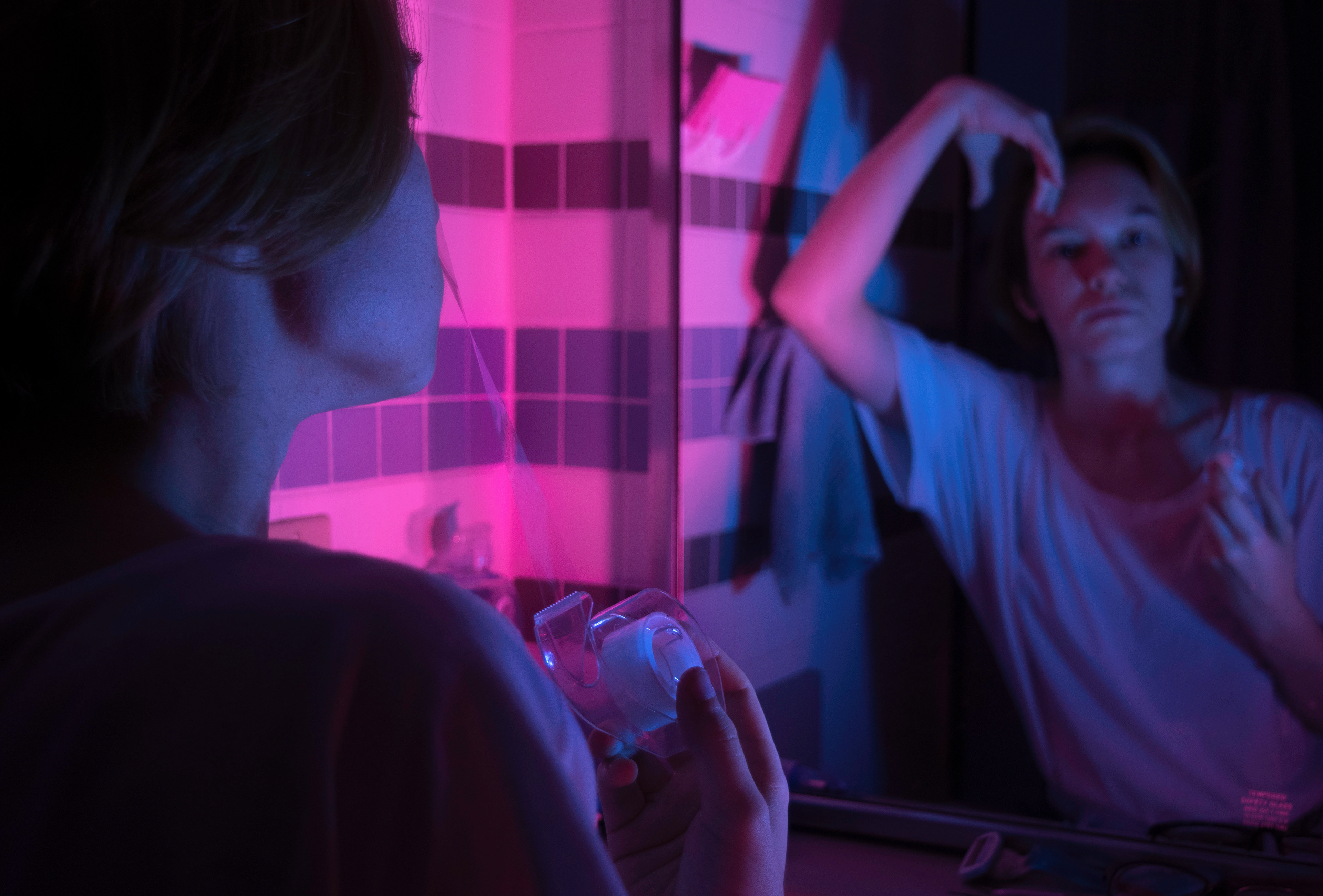 Photo series showing the routine of getting ready to go out but while dissociating. Hints of gender performance.